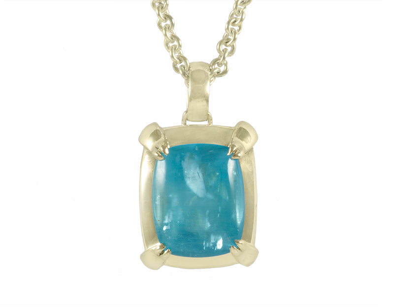 Now, this, is a gem.  An aquamarine cabochon more than 19 mm x 13 mm x 12 mm thick and weighing in at 24 ct.  Gorgeous aqua blue set in solid 18k green gold on a handmade green gold chain.  Made for one of my most stylish of clients it also has a wee hook in platinum at the back to which she occasionally boosts up the colour even more by adding an earring drop from her collection of Disegno earrings.