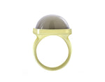 A mesmerizing cabochon of grey moonstone. The adularescence pulls you right into the gem. The moonstone is 28.14 ct and set, as we like it over here at Disegno, in 18k green gold, itself weighing in at a hefty 22 grams. A stunning showpiece.